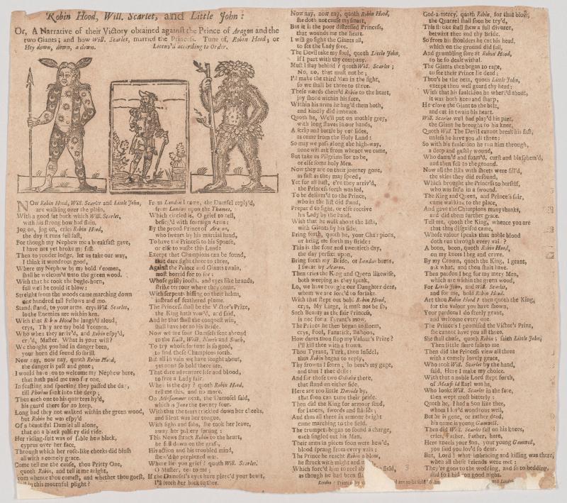 Printed in four columns in roman type; with three woodcuts of (from left to right) a naked tatooed figure bearing a spear and wearing feathers in his hair, a well dressed man walking out of doors with a with a walking stick, a wild man clad in leaves and holding a leafy staff.