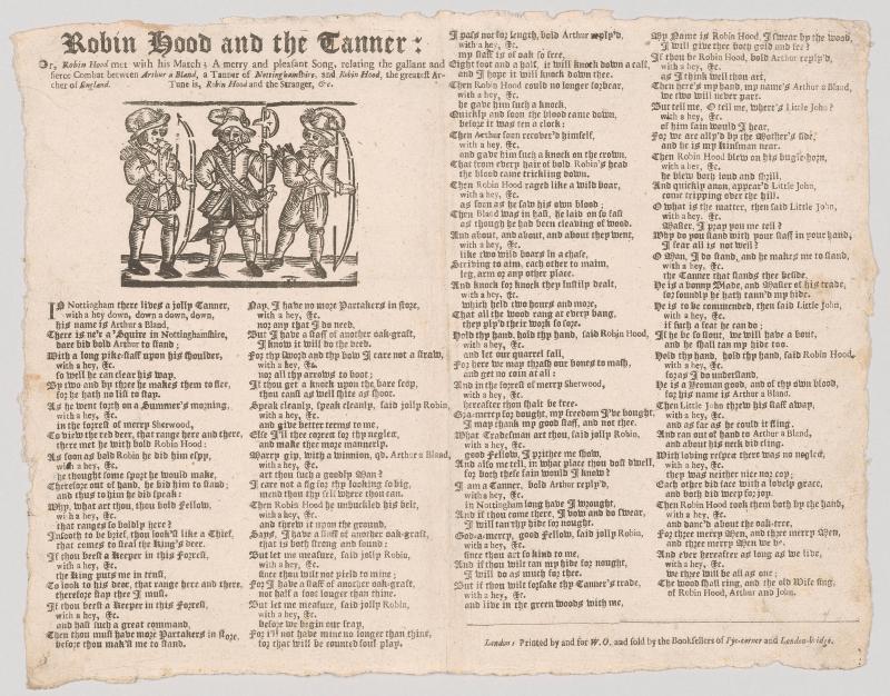 Printed in four columns in black letter; one woodcut below caption title of three men armed with bows and a pole ax (i.e. Robin Hood, Little John, and Will Scarlet?).