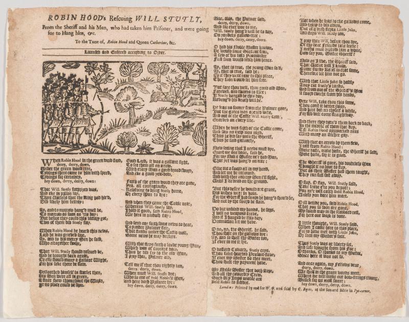 Printed in four columns in black letter; one large woodcut of a hunting scene, with a party of men at left shooting at a herd of deer at right.
