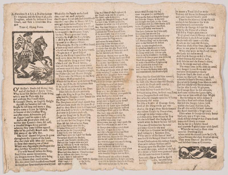 Printed in 5 columns in roman type; woodcut of St. George slaying the dragon in column one; leafy printer's block below column five.