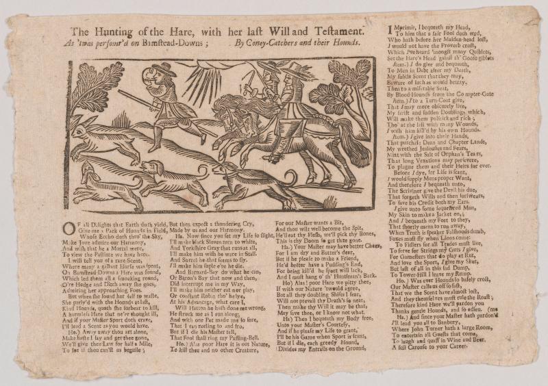 Printed in four columns in roman type, with the title and woodcut above the first three and no rules between columns; woodcut shows a hunting scene with a hare in flight at far left, pursued by dogs and huntsmen.