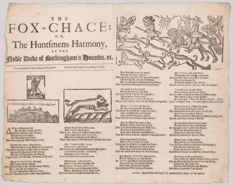 Printed in four columns in black letter; three woocuts above first two, inlcuding a small cut of a hunstmen blowing his horn, a pack of hounds in full cry crossing a bridge, and a running dog(?); large woodcut above third and fourth columns shows a hunting scene, with a fleeing hare at far left pursued by hounds and huntsmen.