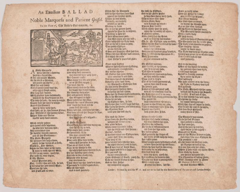 Printed in five columns in black letter; with a woodcut illustration at the head of the first two columns showing a woman (Grissel) seated at a spinning wheel at left, and a group of huntsmen pursuing a stag at right.
