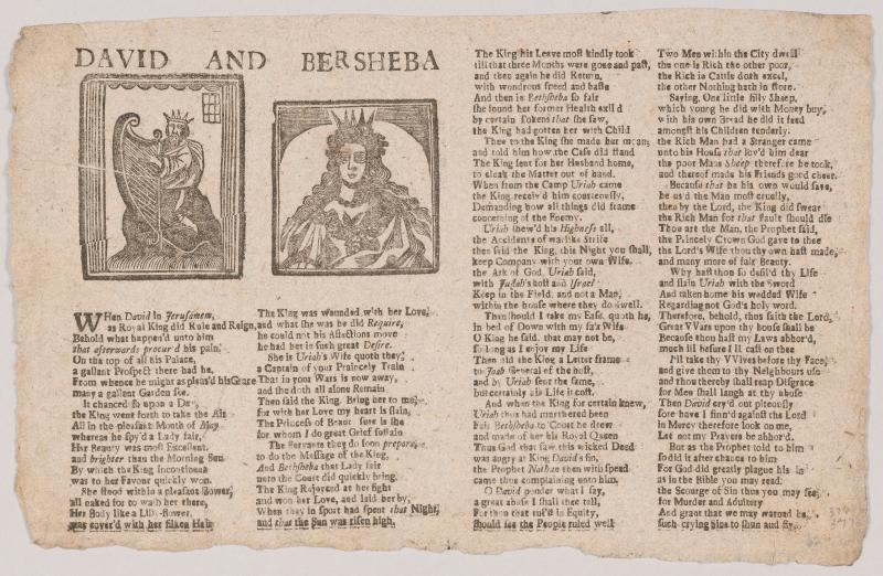 Printed in four columns in roman type with the title and the two woodcuts over the first two columns; illustrated with (at left) a cut showing King David playing the harp, and (at right) a woman wearing a crown.