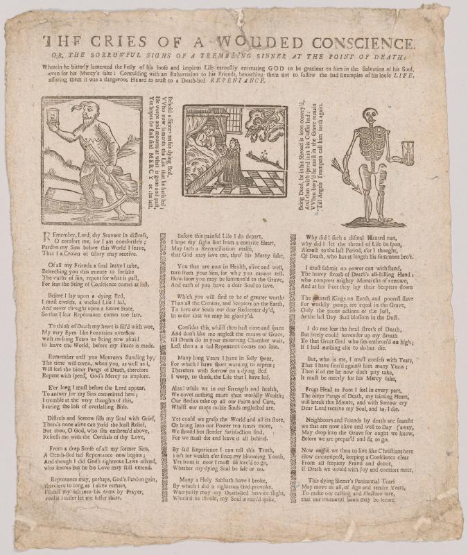 There are two verses printed at 90 degrees to the rest of the text, set between the woodcuts. One begins, "Behold a sinner on his dying bed"; the other begins, "Being dead, he in his shroud is soon convey'd,".
