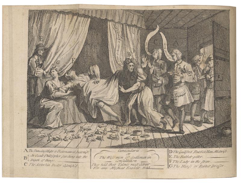 Print shows the interior of a bedroom where (G) Mary Toft lies on a curtained bed apparently in the throes of labour. She is attended by (E) her husband Joshua Toft and (F) his sister Margaret, acting as nurse. (D) Dr John Howard is receiving a dead rabbit from a butcher at the door. There are three other men in the room: (A) Nathaniel St André, (C) John Maubray or Cyriacus Ahlers, and (B) a third (Sir John Manningham or Samuel Molyneux) whose arm is thrust beneath Mary's skirts. Rabbits scamper across the floor; others lie dead; to the right is a chamber pot.