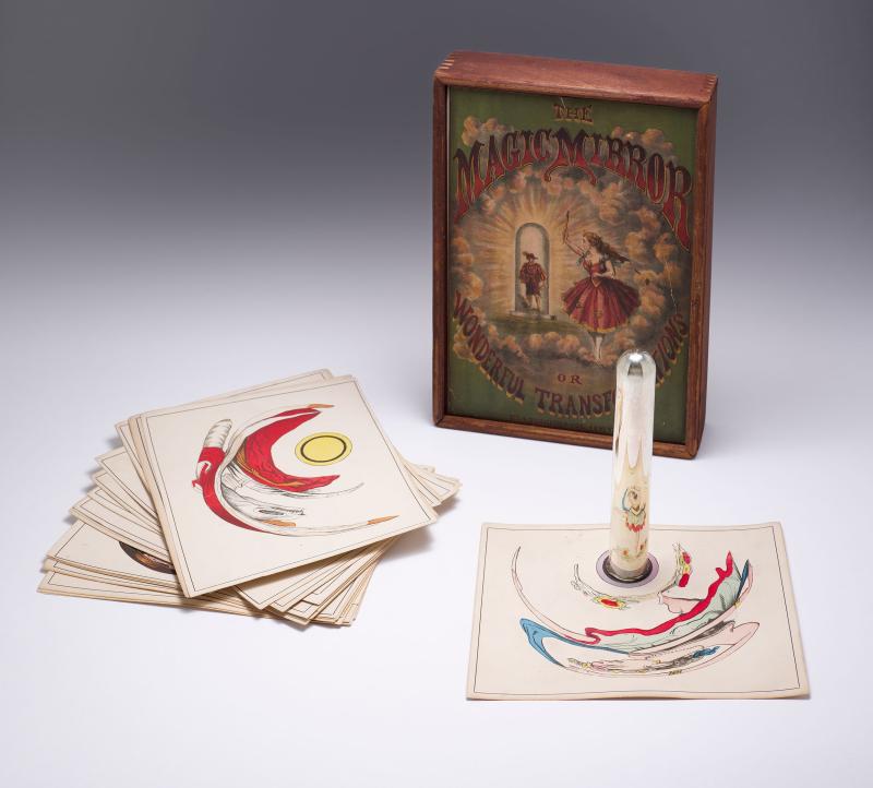 The distorted handcolored pictures come to life, only when the mirror is placed on the circle under each picture, revealing portraits of, for example, Emperor Louis Napoleon, Empress Eugénie, and Sancho Panza on his donkey.