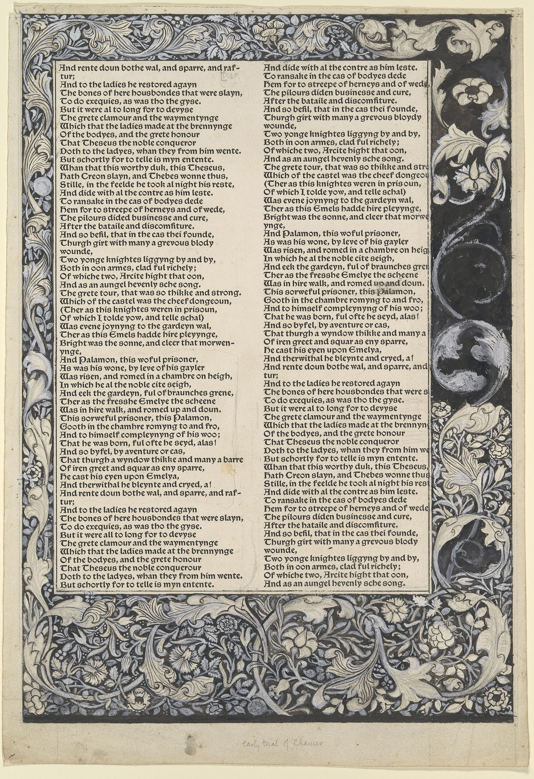 Trial page consisting of a repeated passage from the "Knight's tale", with a hand drawn border around the letterpress executed by Morris in black ink and china white over graphite and abandoned by him before completion.
