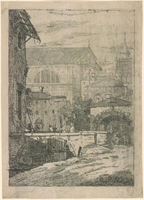 An unrecorded print after a drawing of the same subject by Canaletto (1697-1768) in the Library's collection (1973.48).