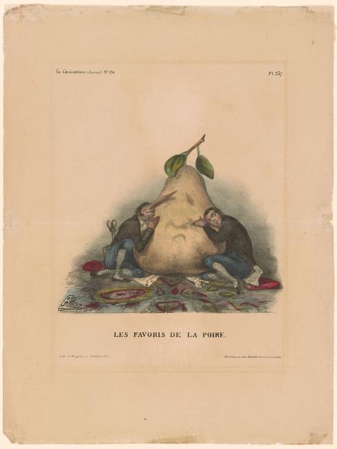 Bouquet was a regular contributor to the satirist publication "La Caricature", which flourished between 1830 and 1835. In "Les favoris de la poire", which appeared in no. 124 of "La Caricature", pl. 257, the artist ridicules Louis-Philippe (the pear), depicted flanked by two of his ministers, d'Agoult and Barthe.