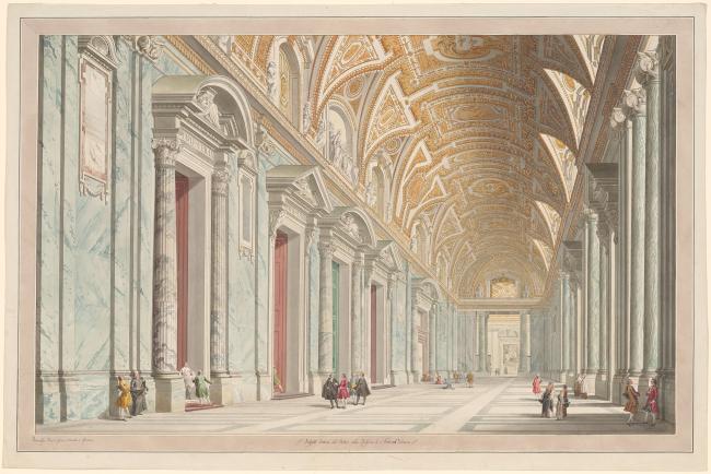 This print is based on an oil painting by the artist's father, Giovanni Paolo Panini, "Atrio di San Pietro" (Ferdinando Arisi, "Gian Paolo Panini e i fasti della Roma del '700", Rome, 1986, no. 399, repr.).