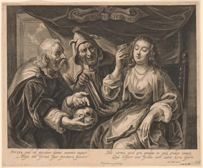 The Latin phrase Nosce Te Ipsum (Know yourself) in the cartouche on the engraving and the text beneath the image leave no ambiguity as to the moralizing subject matter. The text warns that the "foolish" (stulta) girl is concerned only with her fleeting outward appearance and not humbled by her mortality; the presence of a jester underscores her foolishness. -- Exhibition Label, from "Power and Grace: Drawings by Rubens, Van Dyck, and Jordaens"