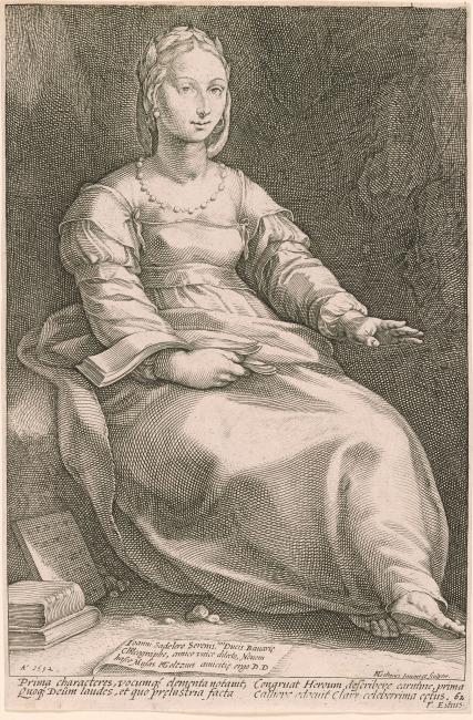 Designed and engraved by Goltzius, one of the greatest Dutch printmakers and draftsmen of the sixteenth century, this print belongs to a series of the Nine Muses that he dedicated to his friend Jan Sadeler, the court engraver to the Duke of Bavaria in 1592. As a series, the Muses clearly represent the effects of Goltizus's journey to Rome on his representation of the human body. Compared to his earlier work, these figures display less contorted, elongated, and dynamic poses; instead, their regular proportions and heavy drapery convey an air of calm grace and stability. It has been suggested that Calliope's form recalls the second-century Roman marble sculpture of the same subject in the Vatican Museum (Strauss 1997, p. 536), and one wonders whether all of the Muses were in fact influenced by other sculptural models as well. Although their passive poses seem repetitive, closer inspection reveals a variety of expression and gesture that differentiate each Muse. This state of the prints was printed for the 1719 edition of Gerard de Lairesse's Principles of Drawing. (Andaleeb Banta)