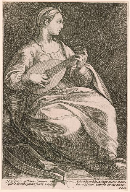 Inscribed at lower right, "HG fe"; in lower margin, "Terpsichoren cithara, et peramenis cattida neruis / Testudo decorat; gaudet saltuq[_] iocisq[_], / Et blandis modulis, et plectro exultat eburno, / Affectusq[_] mouet, tenerosq[_] irritat amores. / F. E. 66".