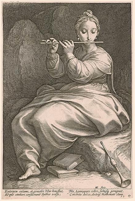 Inscribed at lower right, "HG fecit."; in lower margin, "Euterpen calami, et genialis Tibia honestat / Et quo cantari consuerunt Puthia versu; / Flla Aganippeos colles, saltusq[_] peragrat, / Concetu dulcis, doctoq[_] Mathemate clara.. / F. E 67."