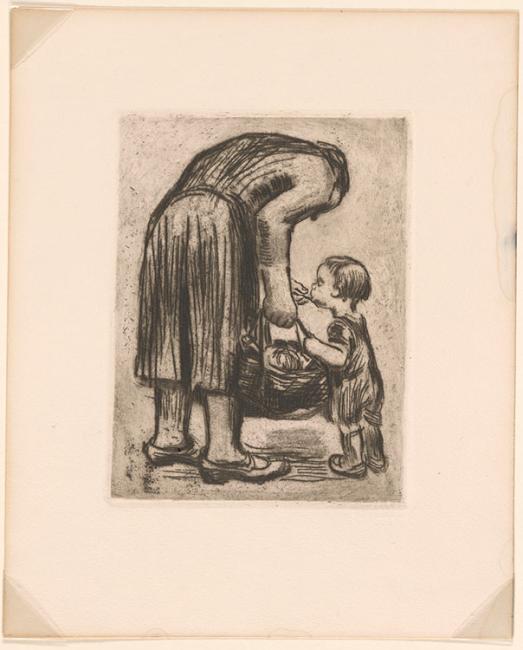 Käthe Kollwitz was a prolific printmaker and sculptor whose long career spanned the politically and artistically turbulent decades of the first half of the twentieth century in Germany. Her works often focus on the plight of the working class and she used her art as social commentary throughout her life. Her many works on the theme of a mother and child are characterized by a combination of helplessness and devotion that make them particularly affecting. Her stylistic transition from naturalism to a unique form of expressionism heightened the dramatic content of her works.
