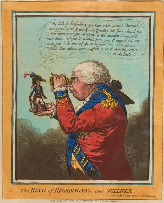 Exhibition label: King George III (1738-1820), portrayed here as the ruler of a race of giants in Jonathan Swift's (1667-1745) Gulliver's Travels, scrutinizes a tiny Napoleon (1769-1821) who stands on his palm, striking a characteristically belligerent pose. Gillray's caricatures of the French emperor were among his most popular prints. They would prove instrumental in fixing the enduring (if exaggerated) perception of Napoleon's stunted stature in the popular imagination. -- On view at the Morgan Library & Museum, Fall 2019.