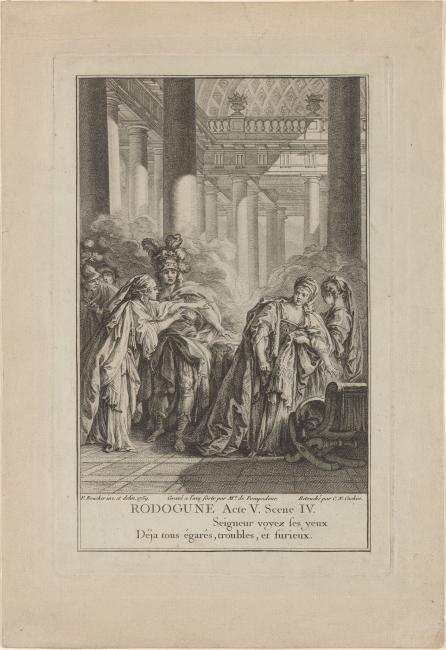 Engraved frontispiece for the 1760 edition of the play, etched by Mme. de Pompadour after Boucher's drawing (III, 104a), retouched and finished by Charles Nicolas Cochin.