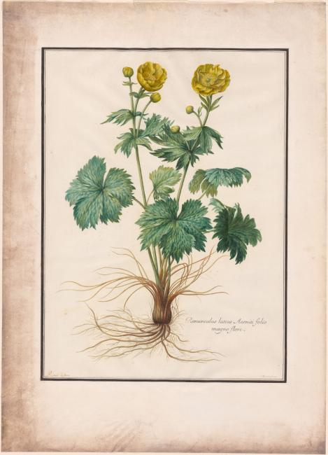 Originally mounted facing its black and white counterpart on paper in Recueil des plantes gravées par ordre du roi Louis XIV, par Nicolas Robert, Louis de Châtillon et Abraham Bosse. Paris : l'Imprimerie royale, 1788 (PML 45382). Now housed separately.