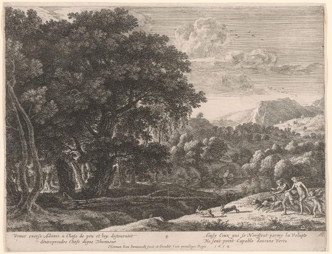Signed: Herman Van Swanevelt fect et Excudit cum previlegio Regis 1654; inscibed below image: Venus exerse Adonis a Chose de peu et luy destourment / dentreprendre Chose digne Dhonneur / Ainsy Ceux qui se Nourissent parmy la Volupte / Ne sont point Capable douenne Vertu.