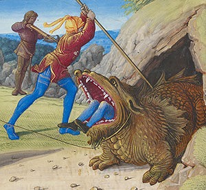 The Taming the Tarasque, from Hours of Henry VIII, France, Tours, ca. 1500. The Morgan Library & Museum, MS H.8, fol. 191v, detail.