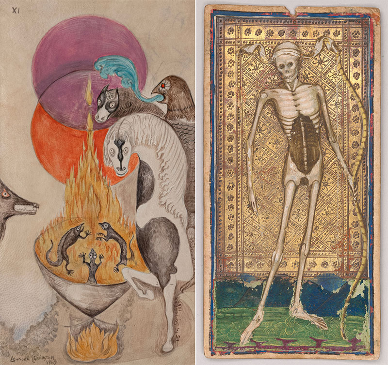 Bonifacio Bembo, Death from the Visconti- Sforza Tarot Cards. Italy, Milan or Cremona, ca. 1456-58. The Morgan Library & Museum, MS M.630.12. Leonora Carrington, Fire Elements, 1969. Gouache on vellum. Collection of Lucid Art Foundation. © 2025 Leonora Carrington / Artists Rights Society (ARS), New York.