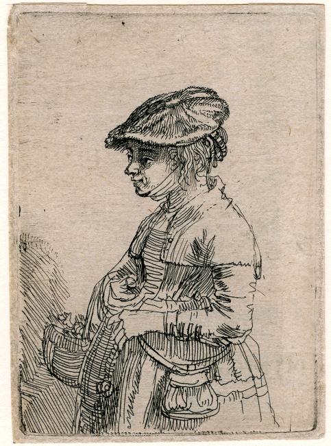 Several vertical parallel lines added beneath the cap, and nearly horizontal lines to the bridge of the nose. The line of the cheek drawn in between her right eye and the nose. Plate trimmed upper right, so margin is now vertical. (White and Boon) Cf. the drawing of "An old and a young Woman in discussion" in Stockholm (Benesch 738). (White and Boon)
