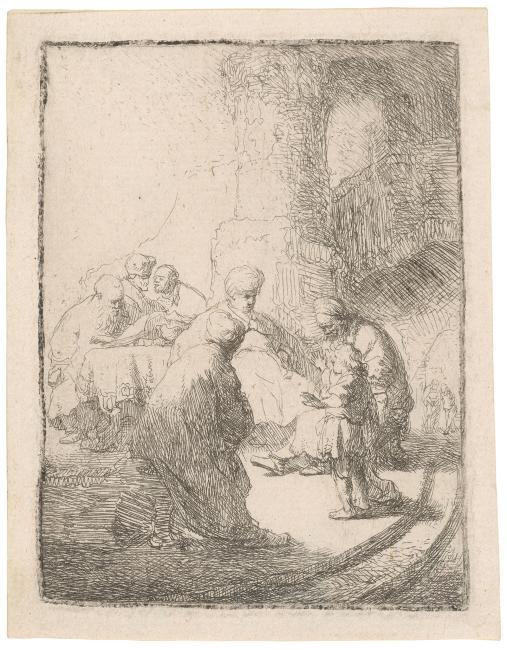 The plate cut down on three sides, removing two figures on the left and the signature at the bottom. Two male figures added to the right of the man seated reading at the table. Plate cut down [from 108 x 78 mm]. (White and Boon)