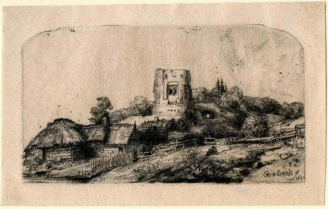 As has been pointed out (in "Rembrandt Exhibition", Florence, 1951, no. 29) this landscape is based on two motifs; the tower of the Old Stadhuis, drawn later by Rembrandt in 1652, and a group of cottages seen on one of the dykes around Amsterdam. (White and Boon)