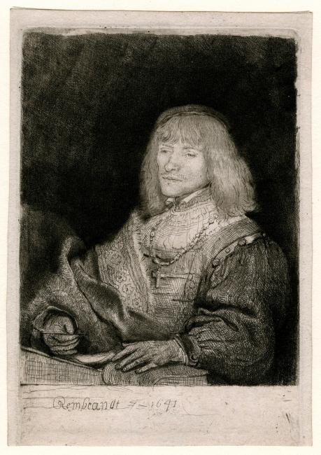 Outlines of the face and hair strengthened in drypoint. Much additional fine shading added to the shadow cast by the figure on the background. The guiding lines, which previously appeared below the sleeve, burnished away. (White and Boon)