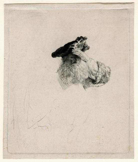 One of two impressions in the Library, both with limited dry-point tone (see RvR 341). The eye on the left side of the face is more clearly defined than in RvR 341.