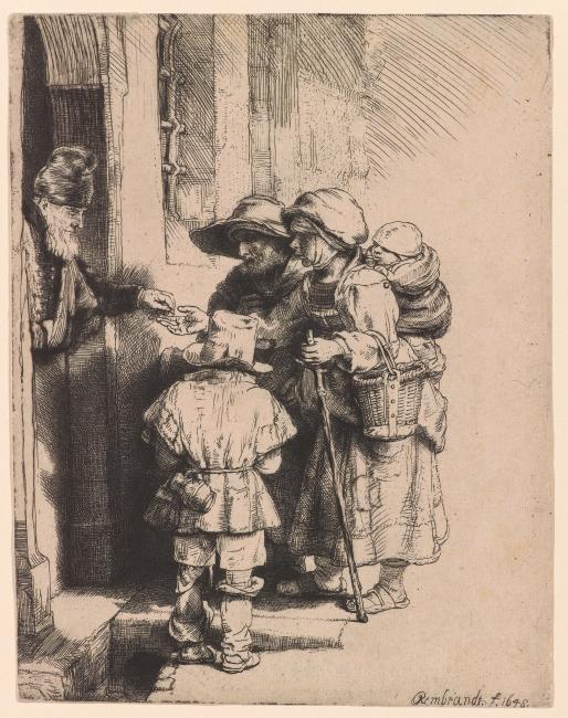 Shading on door-post around head of almsgiver and half-door below him in open cross-hatching. The shadow cast by the boy's jacket on the right part of his trousers is drawn in short verticals. (White and Boon)