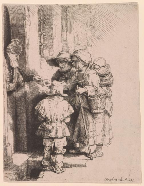 Door-post worked over with very fine cross-hatching. The shadow cast by the boy's jacket, the girl's bodice and elsewhere, reworked with very fine shading in drypoint. Four short verticals now shade white spot at back of cap of the almsgiver. (White and Boon)