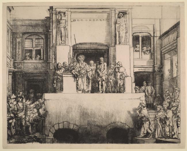 Rembrandt was an avid collector and learned student of history, and his work often references literary and artistic precedents. Indeed, his Ecce Homo was inspired by Dutch artist Lucas van Leyden's famous print of the same subject, done in 1510. Contemporary events in Amsterdam, where Rembrandt lived, also informed his work. The statues depicted in this print, for instance, resemble those found in the city's (then) newly constructed municipal hall, which included a tribunal chamber where magistrates announced death sentences.