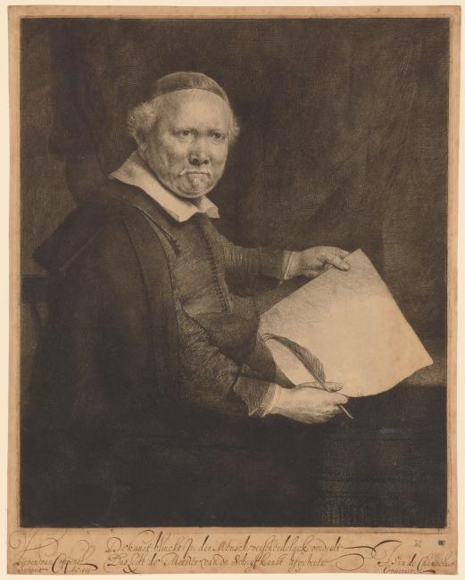 Inscription by Coppenol (the sitter) on the margin at the bottom: "De Kunst blinckt in den Mensch verscheidelÿck verdeelt. / Dus leeft de Meester van de Schrÿfkunst afgebeelt. / J. Six de Chandelier / Composuit. / Lievan van Coppenol/ Scripsit An[o superscript] 1667."