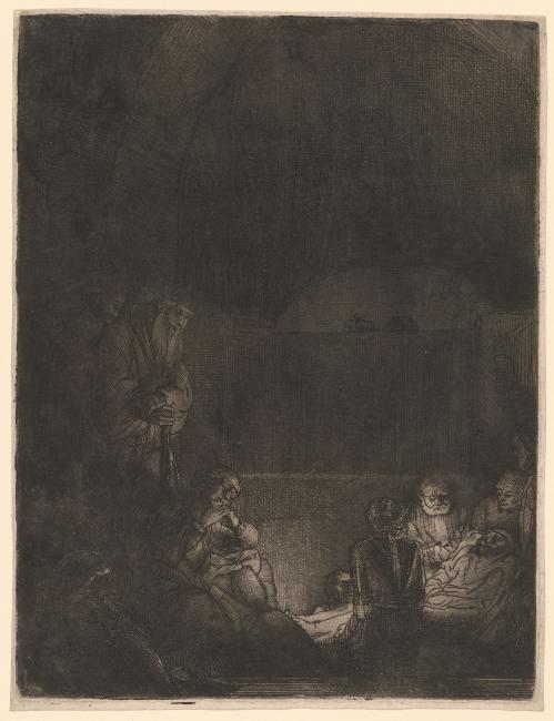 A somber impression with heavy plate tone in which wiping illuminates not only certain figures in the group around Christ's body, but also a portion of the wall behind them. The body of Christ is shadowed by plate tone. (Boston 1969, no. 85)