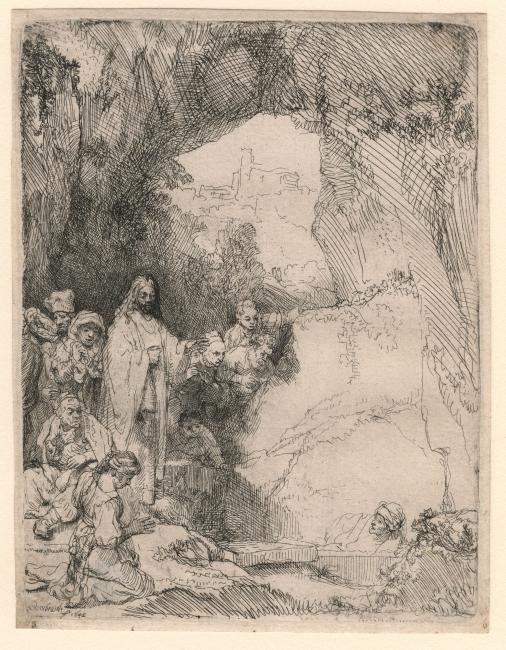 Forehead of Lazarus unshaded, though in the earliest impressions some very faint cross-hatching can be made out, which very quickly wore away. (see R.227)