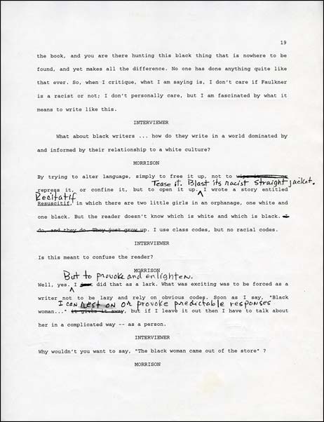 Typed transcript page of Claudia Brodsky Lacour, Elissa Schappell, and George Plimpton interviewing Toni Morrison (1993), with the author's autograph corrections and additions. © 2020 The Paris Review