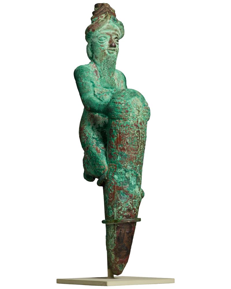 God (probably the personal god of Gudea) wearing short kilt and long split skirt in semi-kneeling posture, supporting between its legs a large peg.