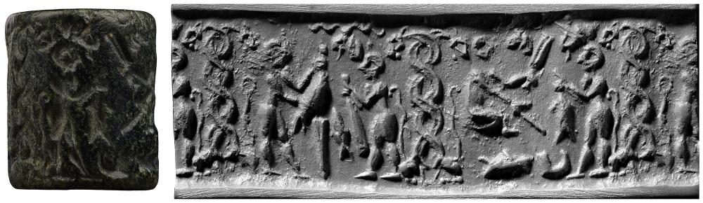 "The scene on the right has been interpreted by Frankfort (Cylinder seals, 1939, p. 20) as showing leather workers. This seems a good explanation, since the scene includes a figure wielding a mallet, an attendant bearing a skin, and a second skin and a shoe lying on the ground. The precise meaning of the snake-necked monsters framing the scenes of 1 is not known. In contemporaneous seal designs they appear in what seem to be merely ornamental motifs. However, it is reasonable to believe that these strange creatures originally had some mythological significance. It is possible therefore that their presence in 1 raises the import of the scenes from a secular to a religious level. The detached animal heads placed in the upper field of 1 do not have any obvious relation to the action of the scenes. The use of these heads is typical of Uruk designs, in which not only detached animal heads but also legs sometimes occur in the field.".... Porada, CANES, p. 2
