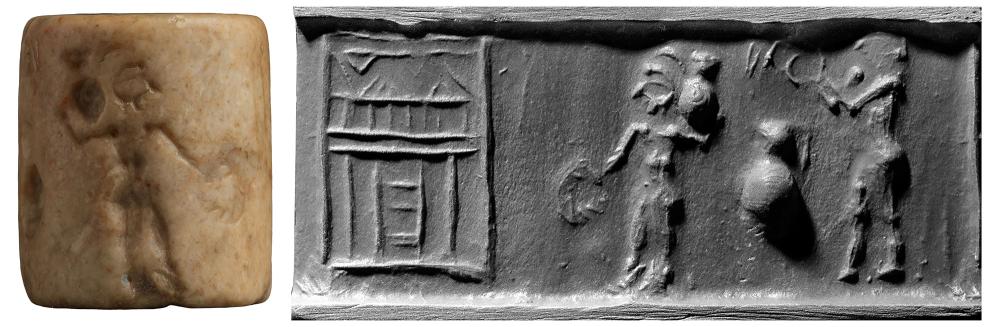 "Seal 3 has been interpreted by E.D. Van Buren as showing priests performing a rite before a shrine. However... it is difficult to judge the character of the figures with certainty, although nudity has often been taken to distinguish priests in representations of later periods." Porada, CANES, p. 3