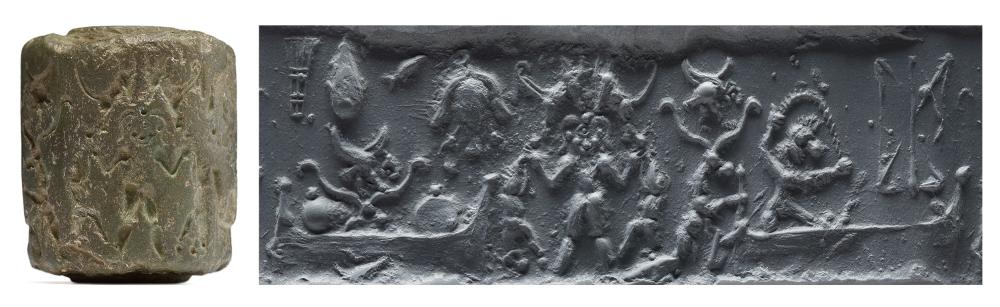 "Seal 4 presents as its central figure a cyclopic hero holding lions. The rest of the scene includes animals, pots, and other types of containers, as well as a human figure and two lion-headed eagles, all apparently meant to be within an inclosure indicated by two stockade-like frames. A related theme is found in a fragment of a vase from Khafajah.... The nude bearded hero seen in 4 remained a stock figure of the Mesopotamian repertory, aapearing for the most part in contst scenes. The cyclopic version of this figure in 4 is paralleled in only one other instance, an Early Dynastic seal impression from Fara (ancient Shuruppak). A plaque from Khafajah of some thousand years later shows a cyclopic demon whose head has the form of a sun. Because of the wide gap in time, however, there is no assurance that the hero in 4 is to be associated in any manner with this figure."--Porada, CANES, p. 3