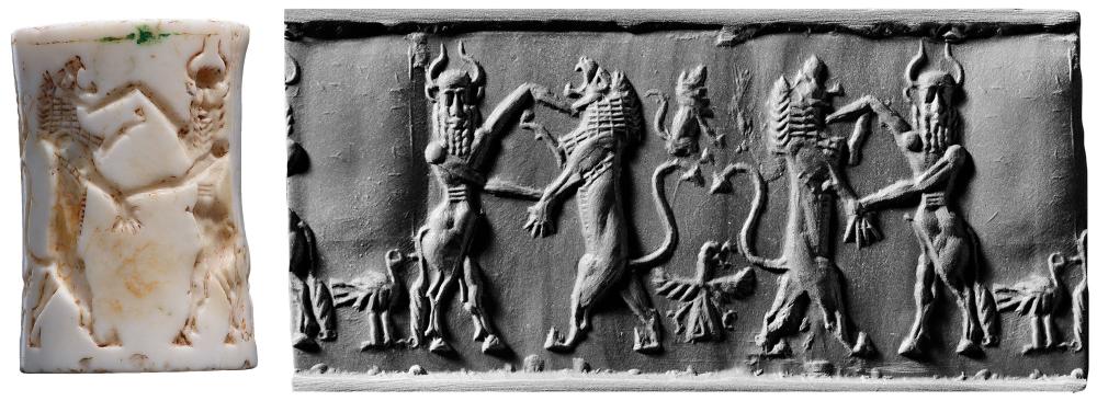 "In the seals of mature Akkad style, the theme of contest between heroes and beasts is embodied in two pairs of fighting figures flanking a central design or the panel of an inscription. A characteristic detail of the resulting rather formal composition is the lozenge effect produced by the arms of the fighters and the legs of their victims. The nude bearded hero and the bull-man are the most common protagonists in these contests, but figures attired like human huntsmen often take the place of the nude bearded hero (165) or of both fighters (166, 169). In other instances two identical bull-men (167) or nude bearded heroes (168) are represented. Water buffaloes and lions are the most frequent opponents of the heroes. In these seals of mature Akkad style, lions are almost always shown in profile. The scene of 170, showing a figure pouring a libation beside the two fighting pairs, is exceptional." Porada, CANES, p. 22