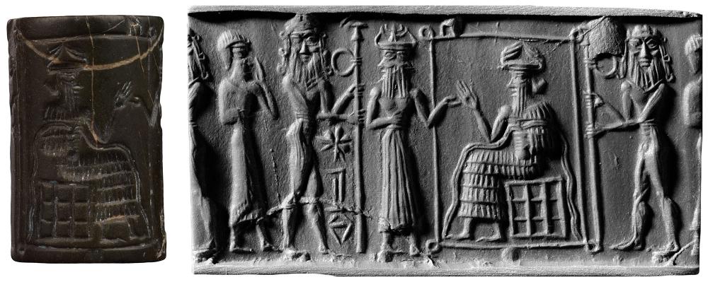 "Another deity often shown on Akkad seals is the water god, Ea, who bears a vase from which two streams flow over his shoulders; usually there are fishes swimming along these streams ... Seal 202 shows the water god seated in his ocean chamber ... In 202, 203, 205, the god is shown approached by worshipers." Porada, CANES, p. 25