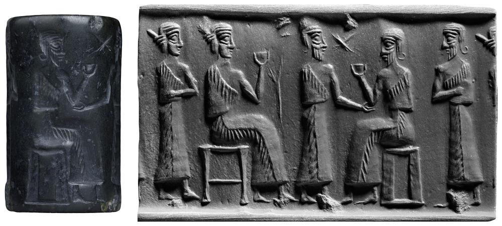"Banquet scenes, which occur so frequently on Early Dynastic seals, are found on only a few Akkad cylinders. In the latter the banqueting figures are occasionally identified as deities by their horned miters (248, 249), whereas in the earlier renderings the character of the figures remains undetermined. Even in 250, in which the figures do not wear horned miters, they are characterized as superior beings by their seats: the female personage sits on a stool fashioned with what appear to be bull's legs, the male personage on a throne shaped like a shrine." Porada, CANES, p. 30