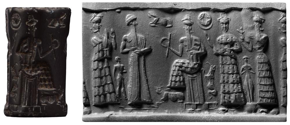 "In 387 and 388, the god stepping on the dragon rests his hand on a scimitar. In 389 and 390 he is enthroned with his feet on the back of the dragon and appears to hold a rod. Such a rod, together with a ring, appears in the hands of a number of apparently different gods on Babylonian seals. For example, the two objects are held by the enthroned god in 391. This deity may be the sun god, since the latter appears without his saw but with a rod and ring in the relief on the stele bearing Hammurabi's code. This suggestion is possibly confirmed by the appearance in 391 of a bull in the sky and of another under the feet of the deity, since this animal is frequently depicted in association with the sun god on Old Babylonian seals... The double pleats in the robes of the deities resemble corresponding details in impressions on tablets of the time of Hammurabi and of Samsu-iluna, his successor (Louvre A. 527 J, E; Louvre A. 553 A, E). A similar dating is therefore suggested for 391." Porada, CANES, p. 48-49