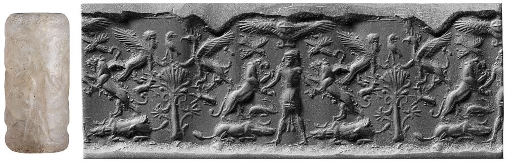 Center: hero grasping lion at either side, each lion on back of kneeling bull; above each lion, bird of prey; below first lion, kneeling antelope; over whole group, winged sun disk -- Terminal: bird of prey between female sphinx and griffin, each monster resting hind foot on one lion of main motif, other hind foot on small antelope, while forefeet of both monsters rest on crown of palmette tree.