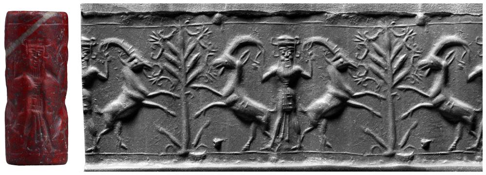 Bearded hero (full face), dagger in each hand, standing between two ibexes that jump away from him, each toward tree that is flanked by them as scene repeats.