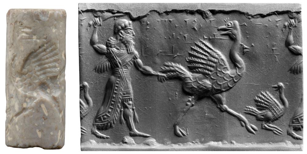 "The interpretation of the griffin as an equivalent of the angel of death may furnish an explanation for the scene of 606, which shows a winged hero pursuing ostriches, usually regarded as harmless animals. Nevertheless the Assyrian may have seen an earthly counterpart to the supernatural griffin in this bird, because of its size and because it lives in the desert, which was believed to be an abode of the dead."--Porada, CANES, p. 70