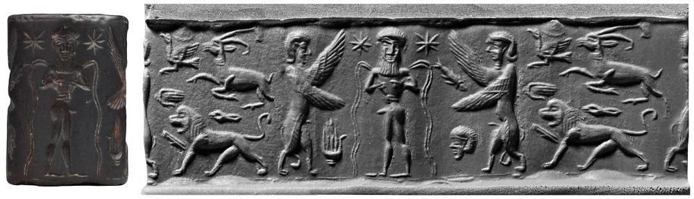 Two winged lion-demons, one at either side of nude bearded hero with stream flowing over each shoulder, star at either side of his head -- In field: hand; human head -- Terminal: bird and hand before ibex above walking lion with animal head above its back.